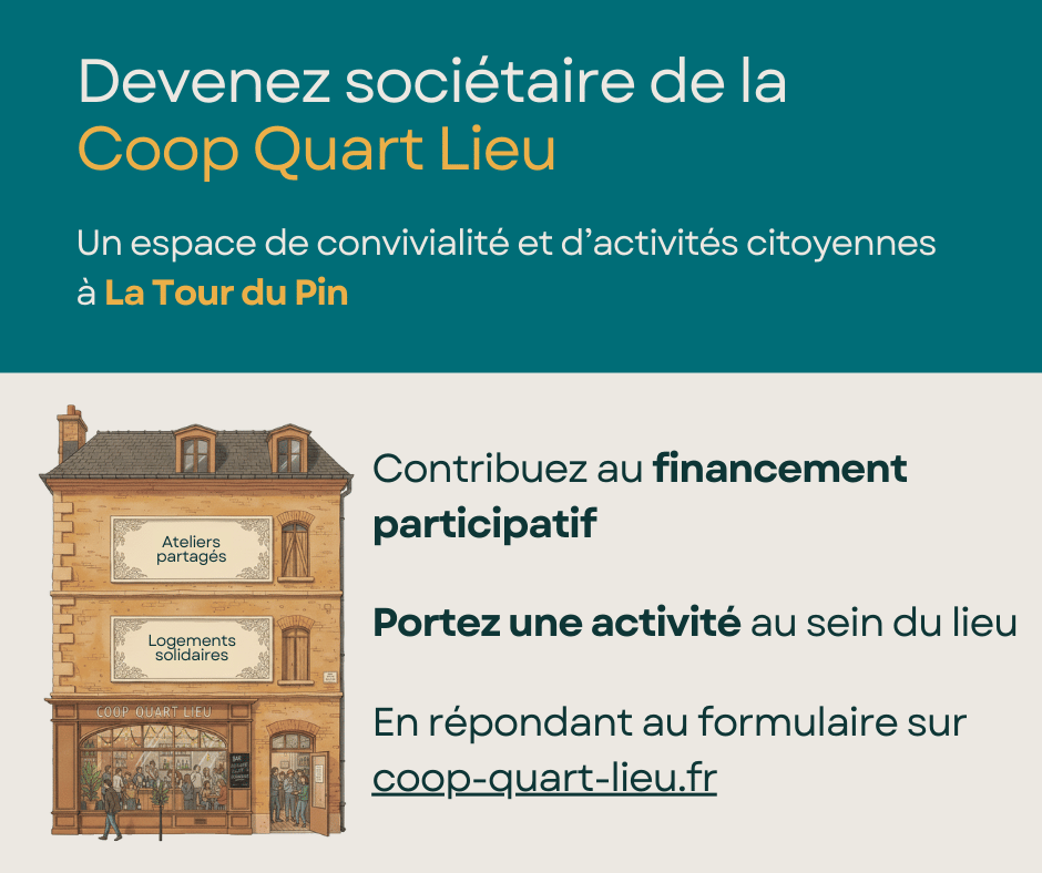 Un lieu accueillant, débrouillard et respectueux de notre Terre au cœur de La Tour du Pin. La Coop Quart Lieu veut créer un espace citoyen avec bar/cantine, salle d'activités et extérieurs pour réunir associations, entrepreneurs et habitant.es. Rejoignez la coopérative en épargnant de manière solidaire ou en proposant des activités au sein de ce nouveau lieu ! Pour en savoir plus : https://www.coop-quart-lieu.fr